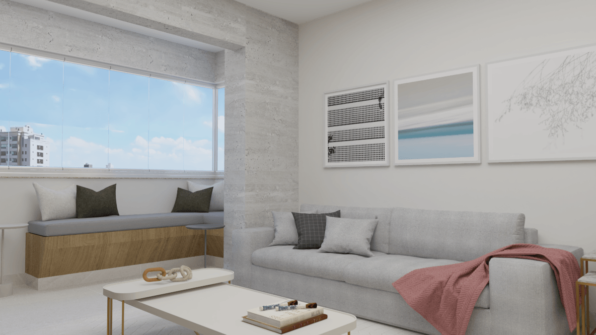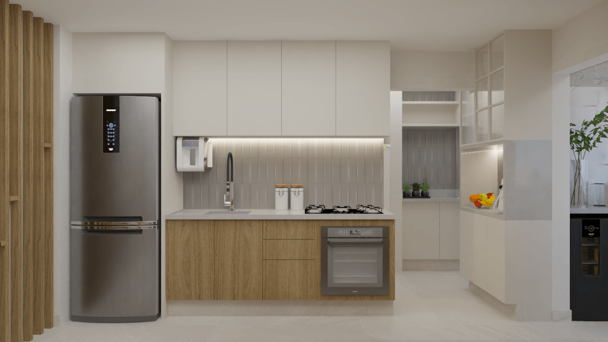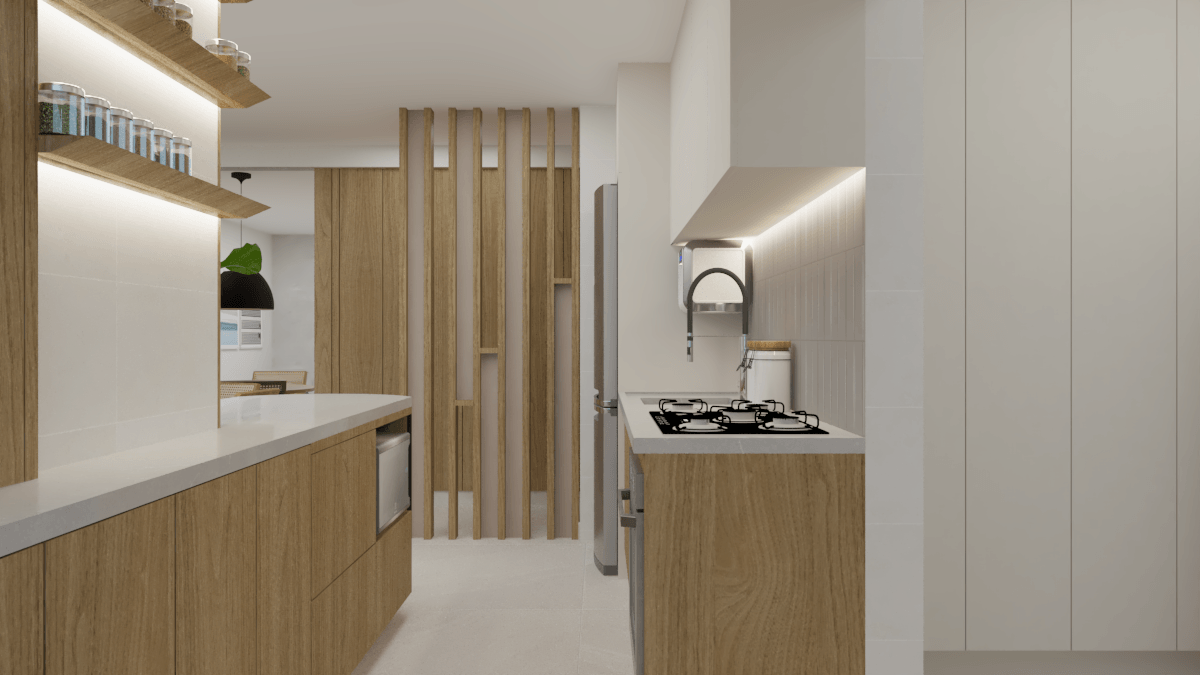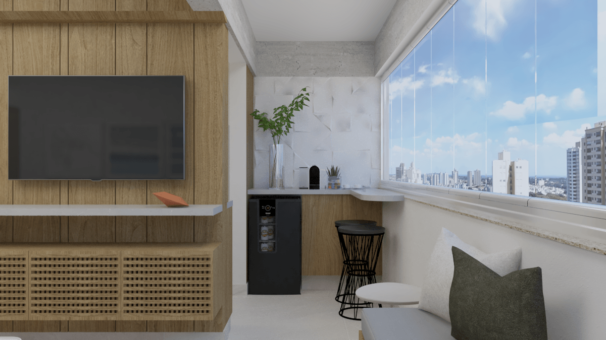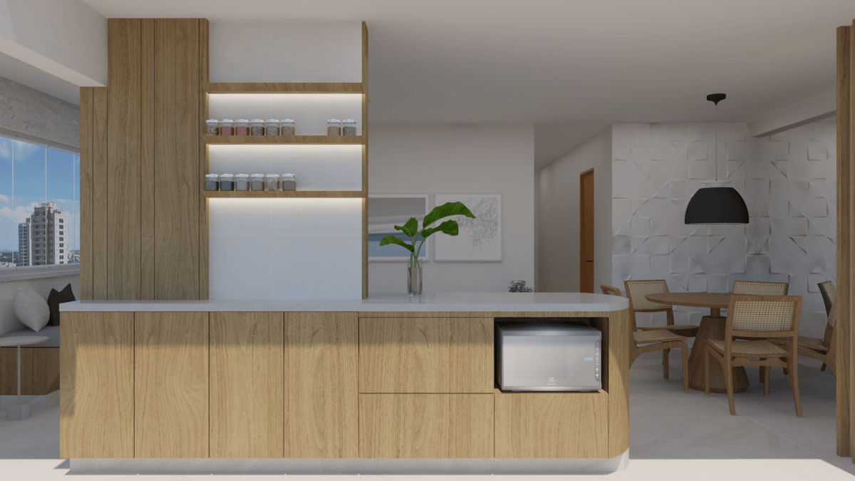 Em nossa proposta de design, integramos de forma harmoniosa a varanda, sala e cozinha, criando um espaço fluido e convidativo. A cuidadosa combinação de elementos e materiais proporciona uma atmosfera acolhedora e expansiva simultaneamente. A madeira desempenhou um papel essencial, adicionando aconchego e naturalidade aos detalhes dos móveis e painéis.